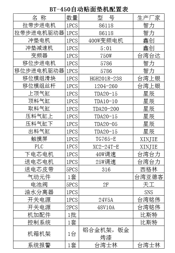 三、BT-450自動貼面墊機配置表